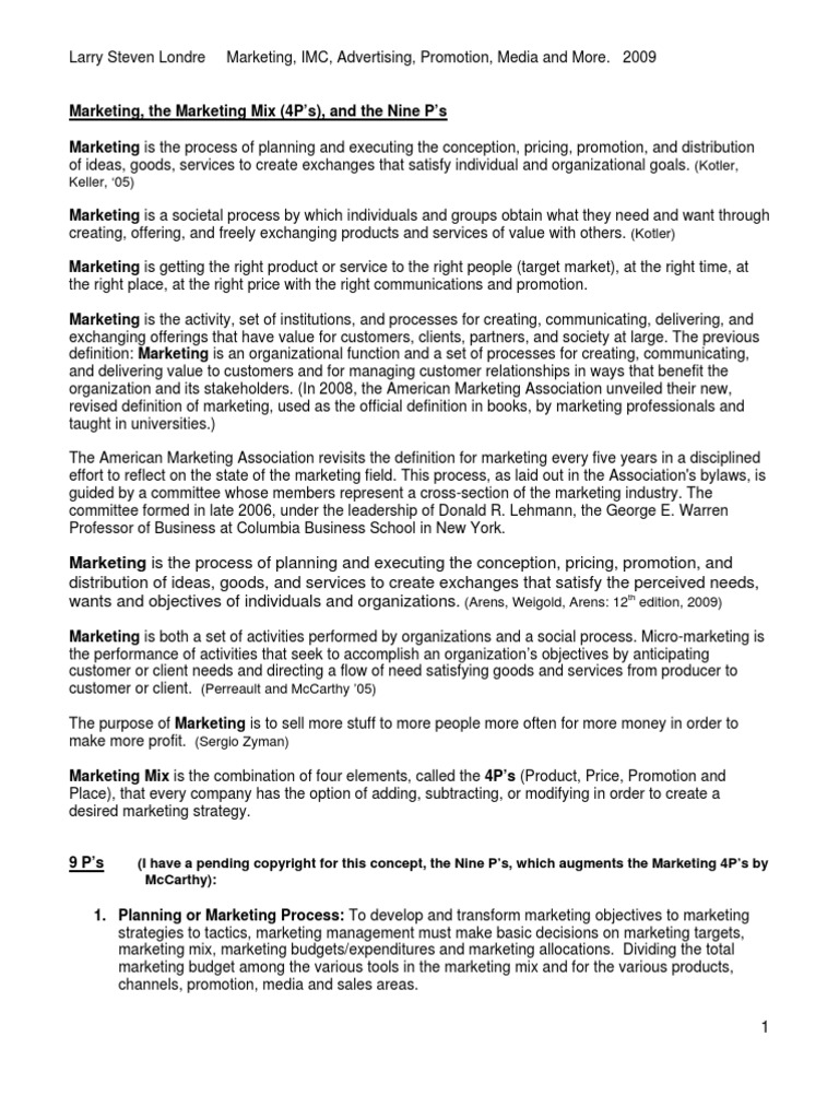 Marketing The Marketing Mix 4p S And The Nine P S 1 Marketing